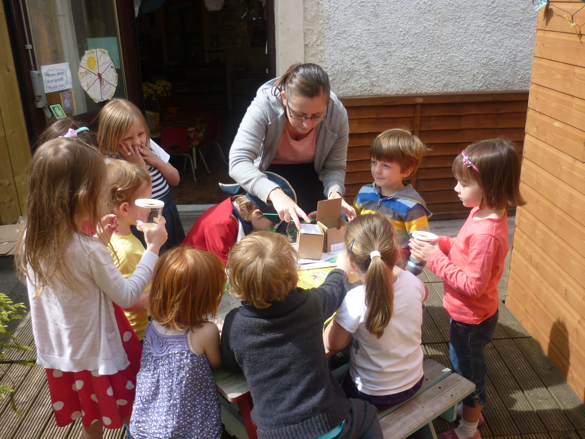 Today our caterpillars arrived and we have put them into the music room so that we can watch them grow big and fat. Some of us know what is going to happen after that – some of us have been talking about cocoons and butterflies! The babies have their own set of caterpillars too so that they can join in the fun.