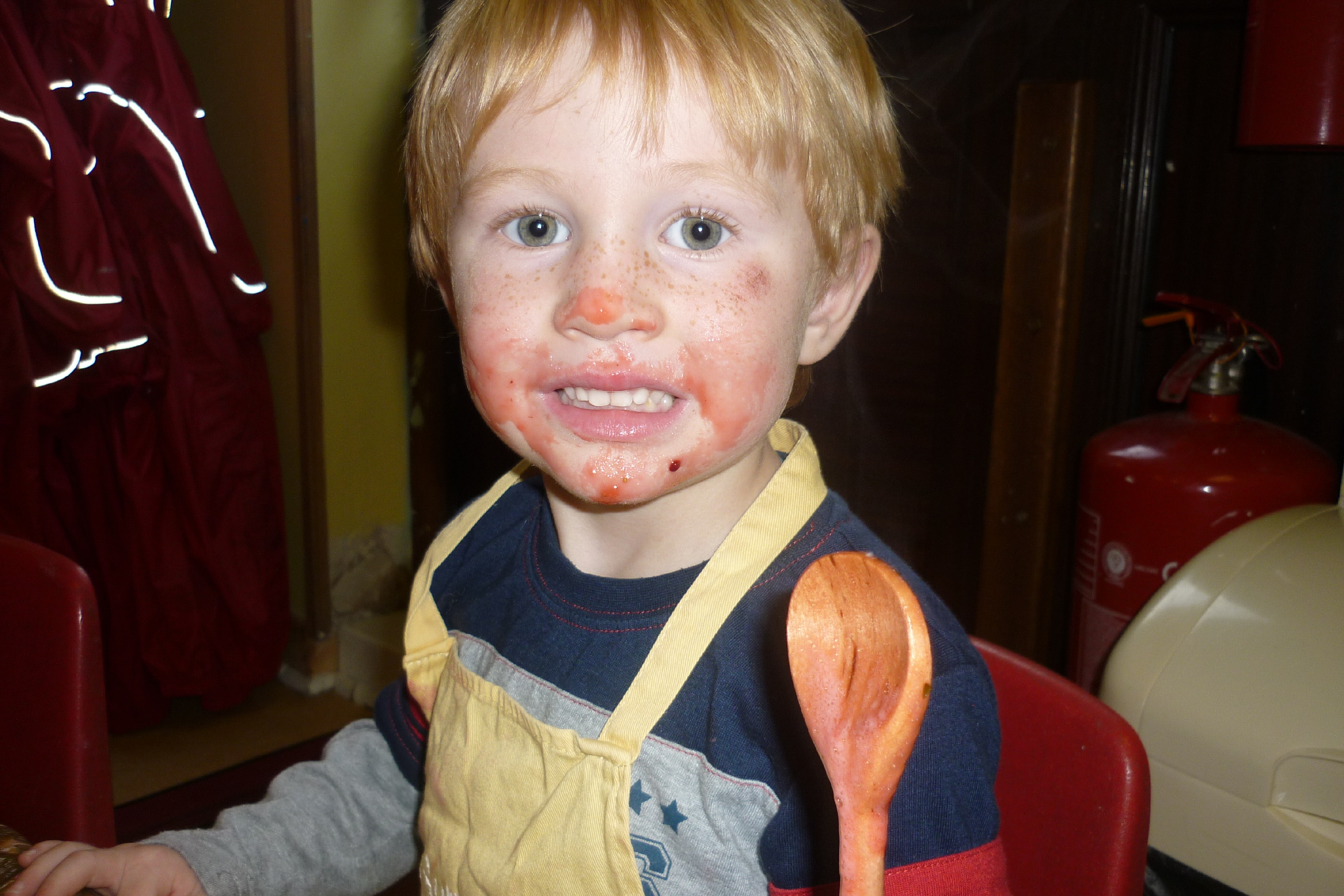 This morning we all made our own strawberry and bramble jam. Here is Alistair doing the taste test!!