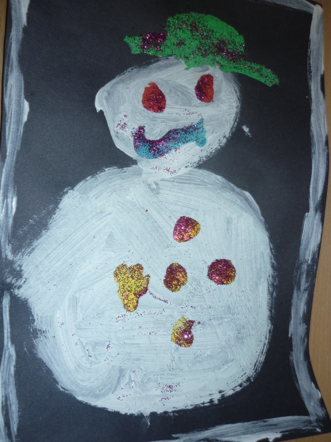 This is the picture that Ella painted today. We are getting the nursery ready for Santa’s visit and have been painting windows and making Christmas Cards.