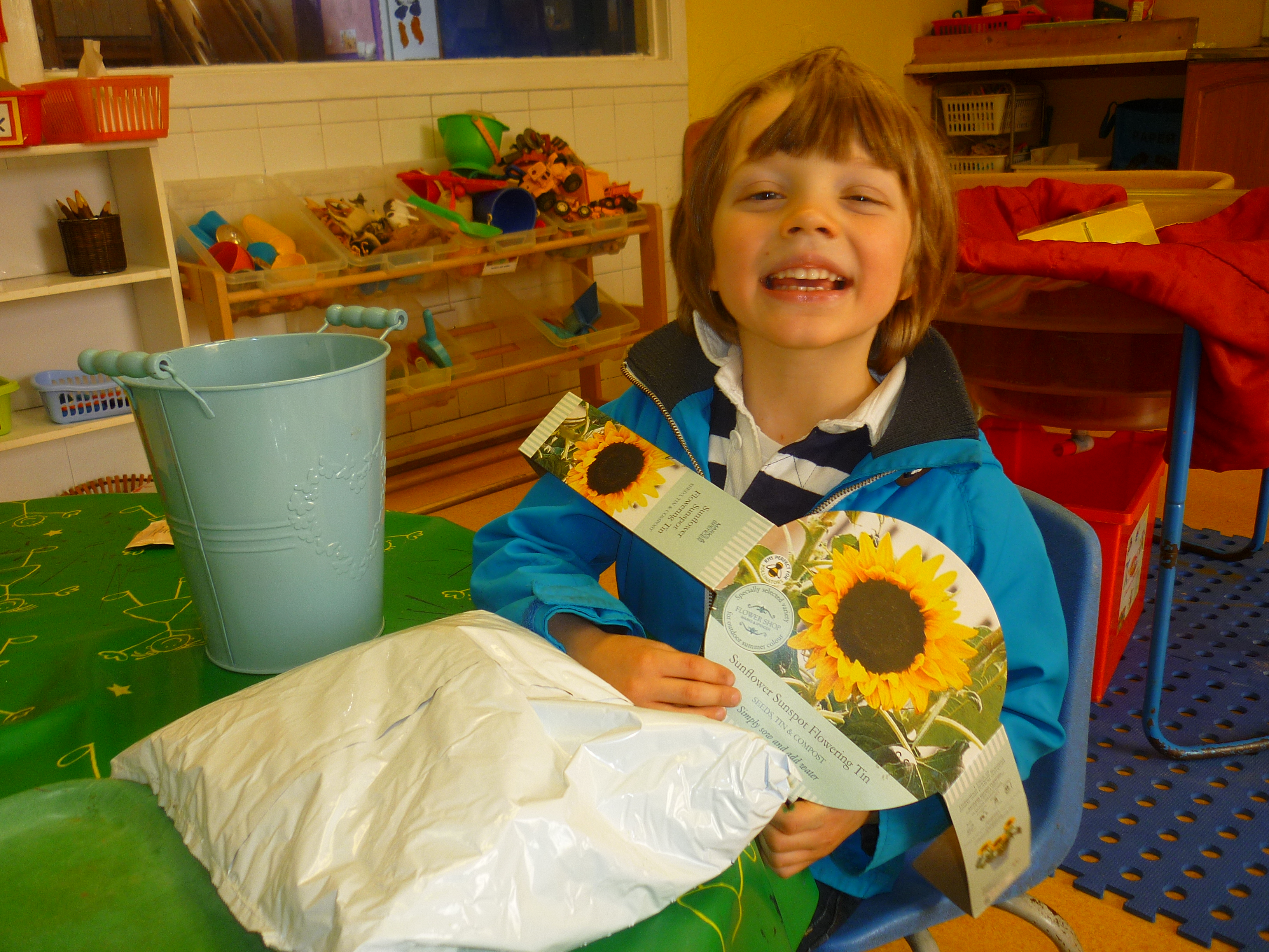 We have been doing loads of planting and growing these past few weeks. We planted our apple tree in the Meadow, also some bedding plants there too. We have planted tomato plants and runner beans. Now we have some sunflower seeds growing. How happy does Sandy look?