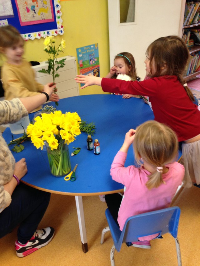 Doing the thing where we change the colour of the petals by putting food colouring in the water.