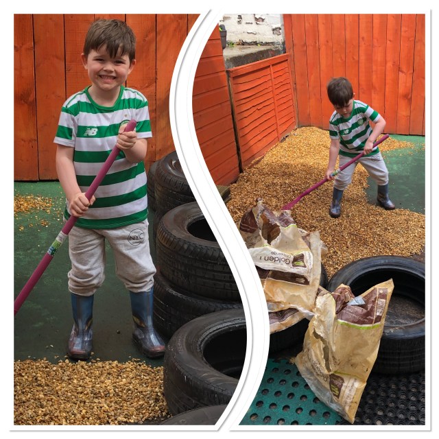 This guy very very keen to be involved in this. He used his sound mathematical judgement to estimate we still need 6 more bags of stones!