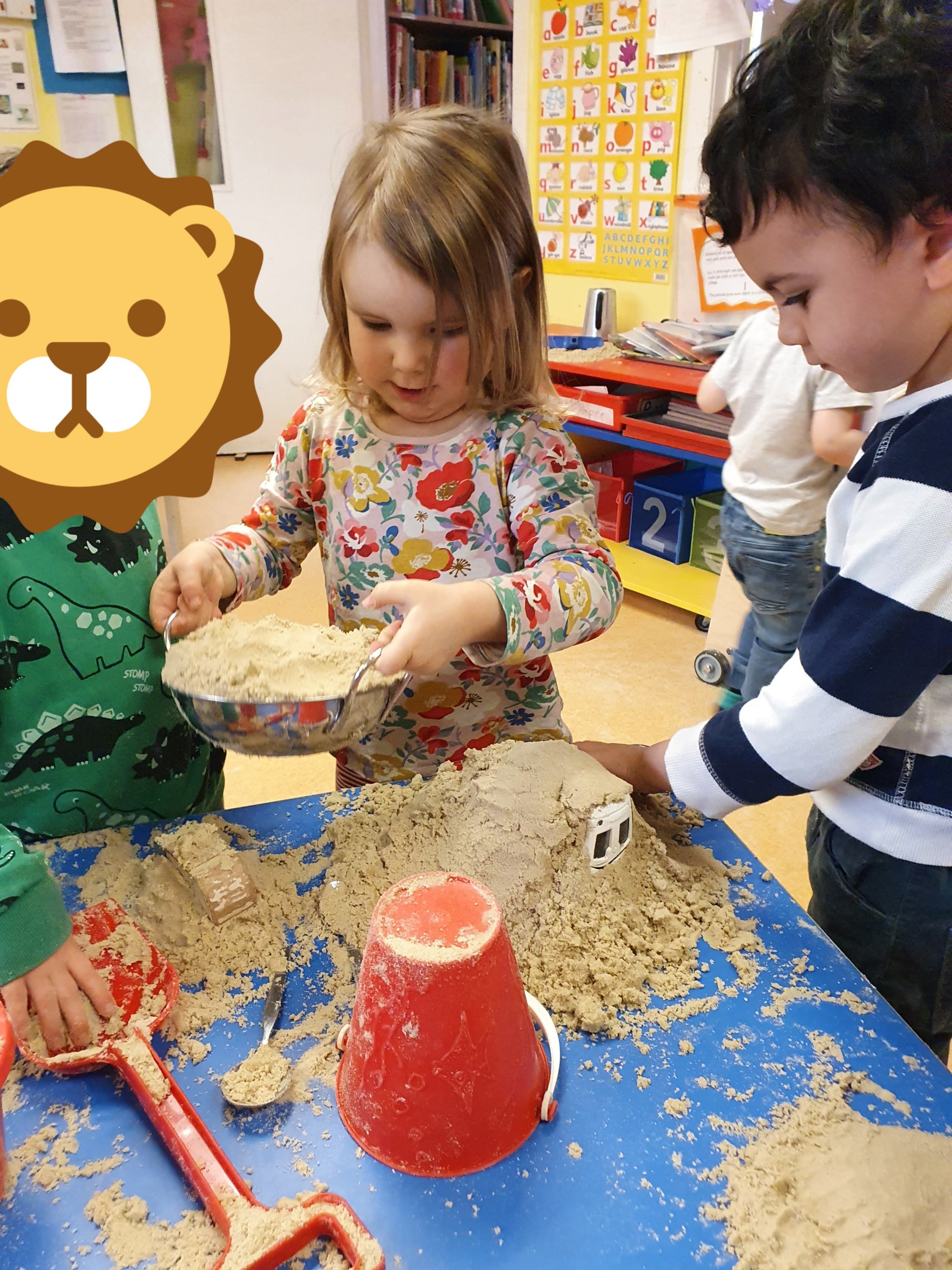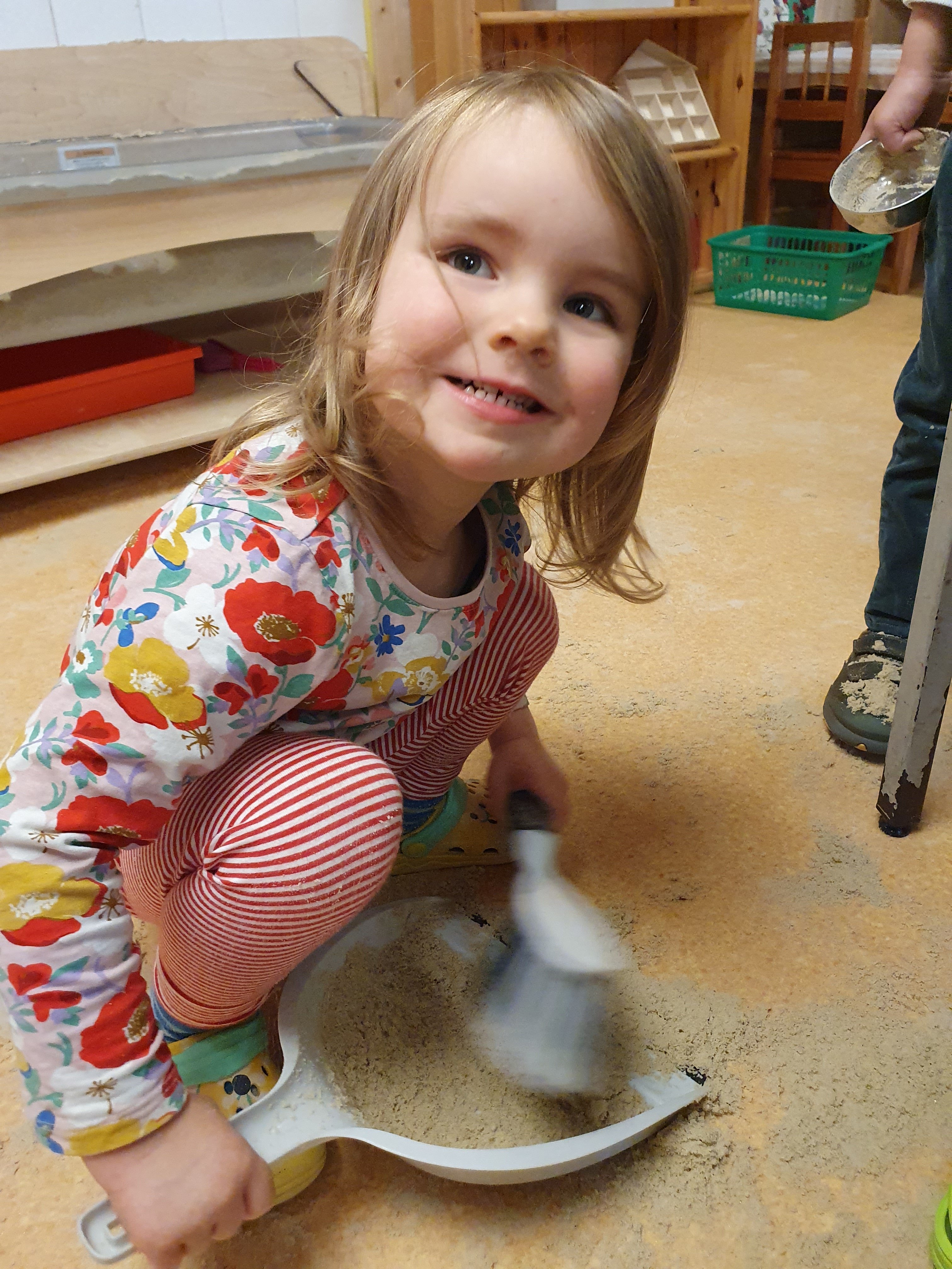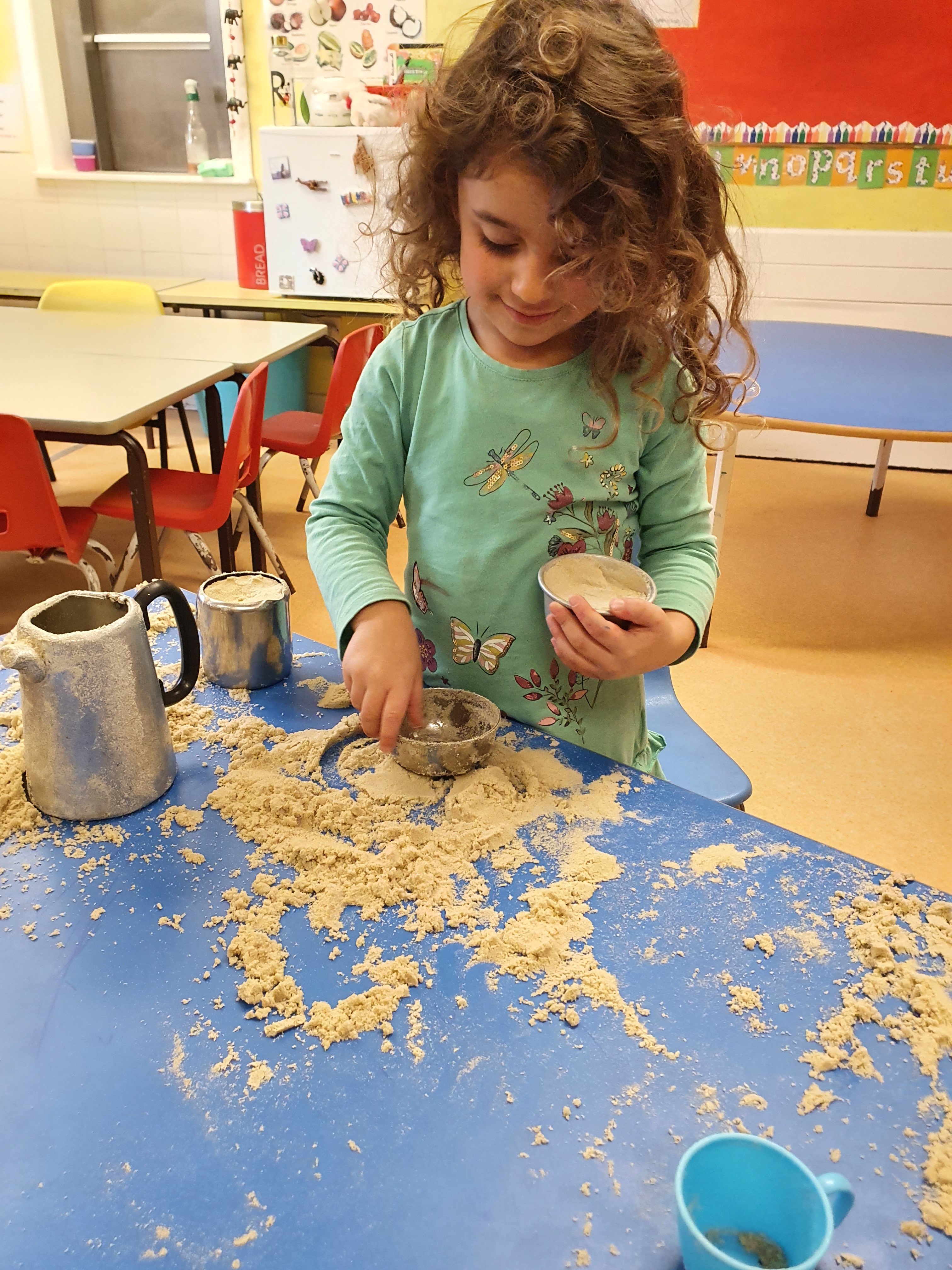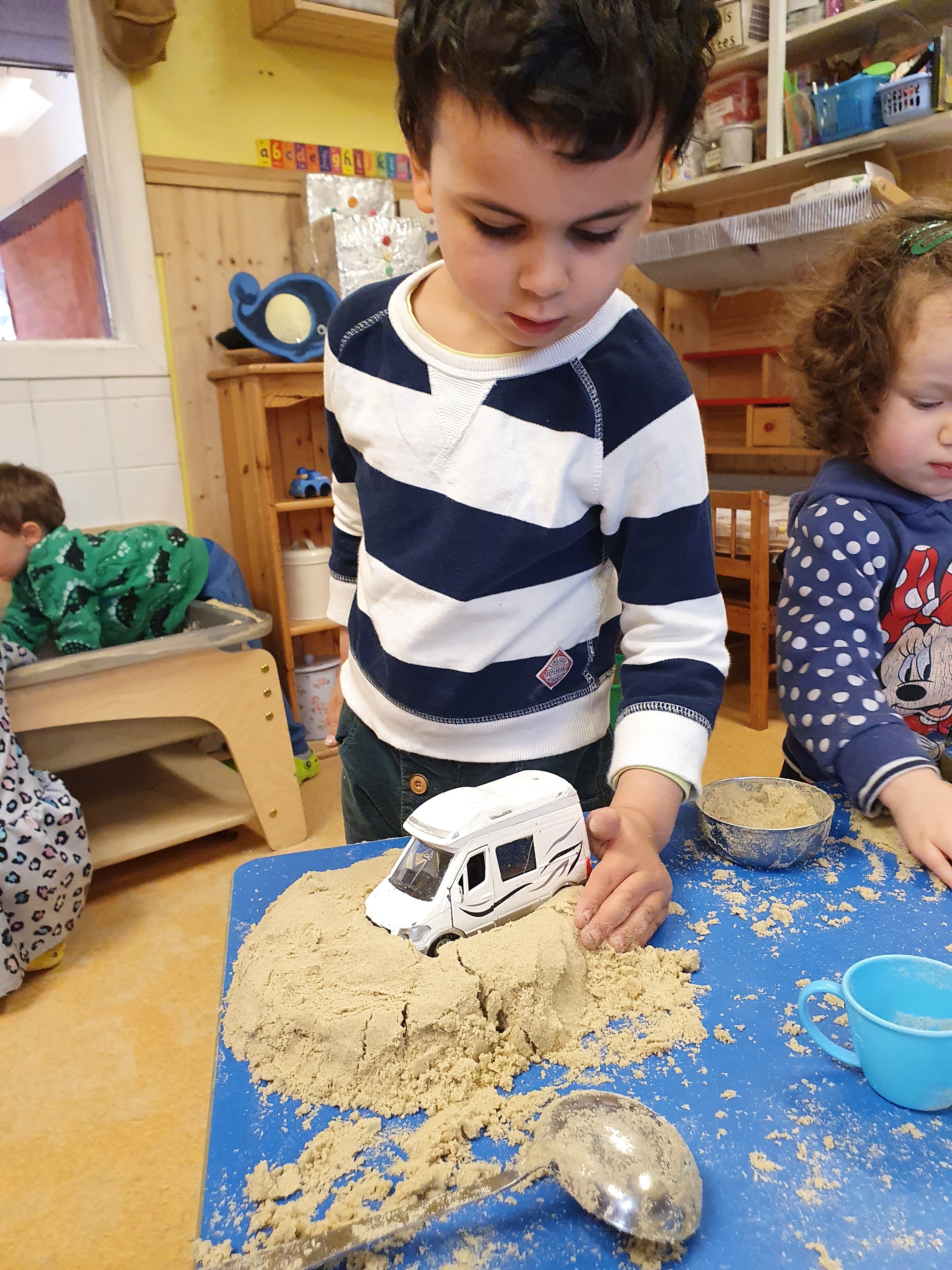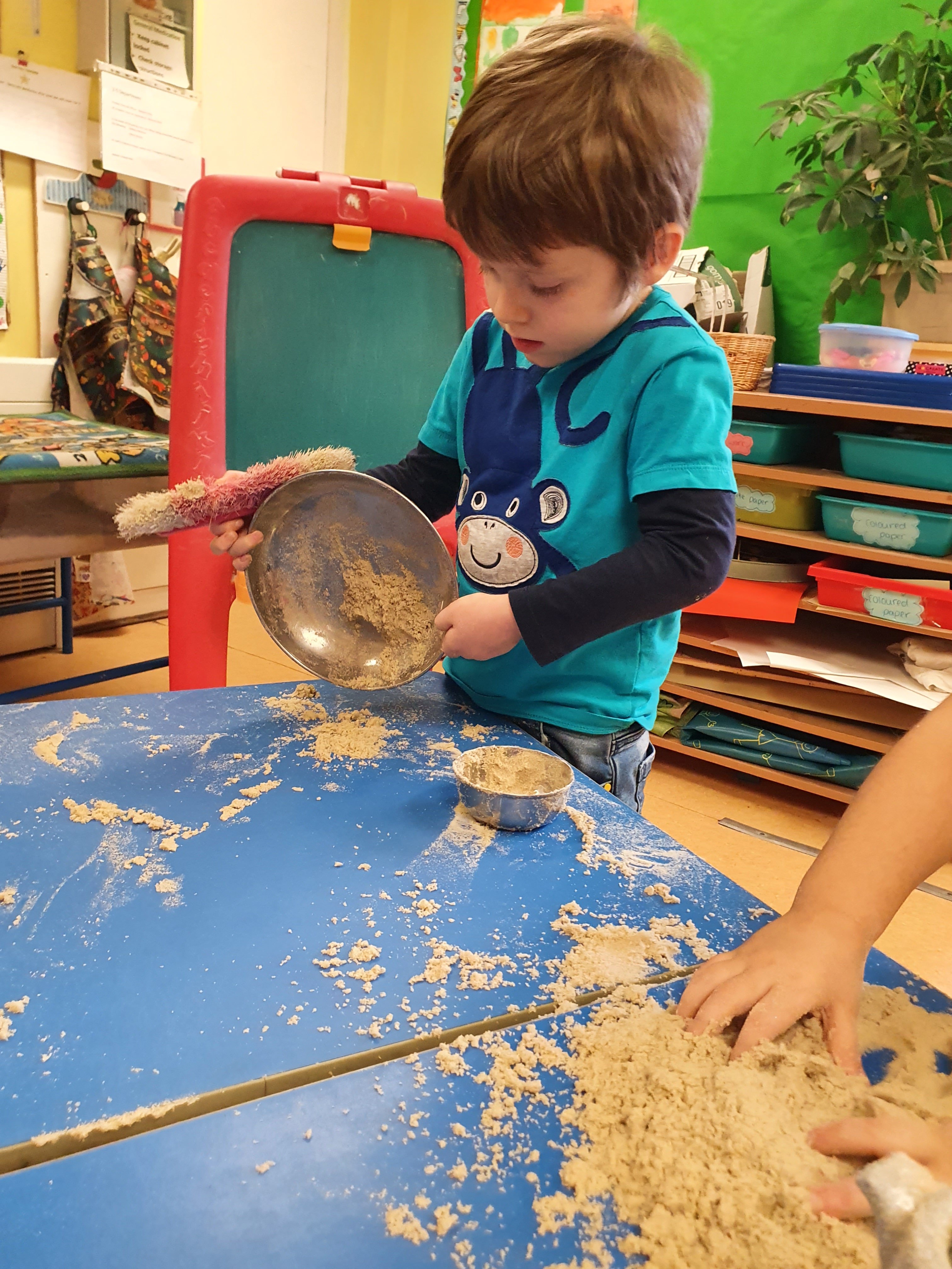 One of our learners began this trend by starting a cafe and putting cups on the table, before we knew it our play expanded fast. We began burying cars, using diggers for scooping and playing pat a cake. We also remembered to help sweep up the mess at the end!