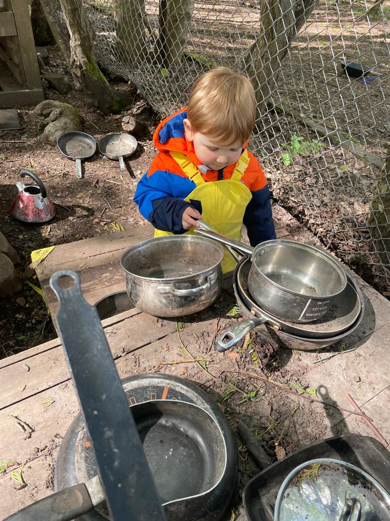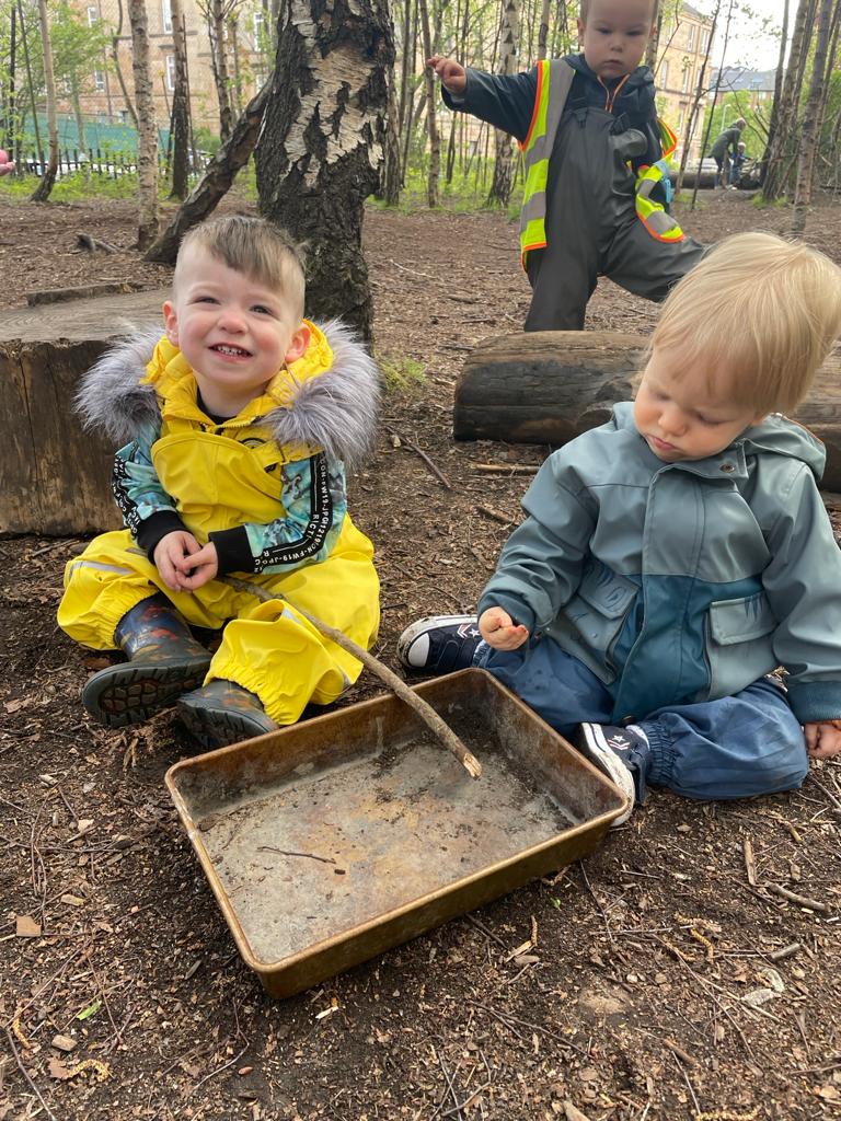 The babies exploring the mud kitchen in the children’s wood