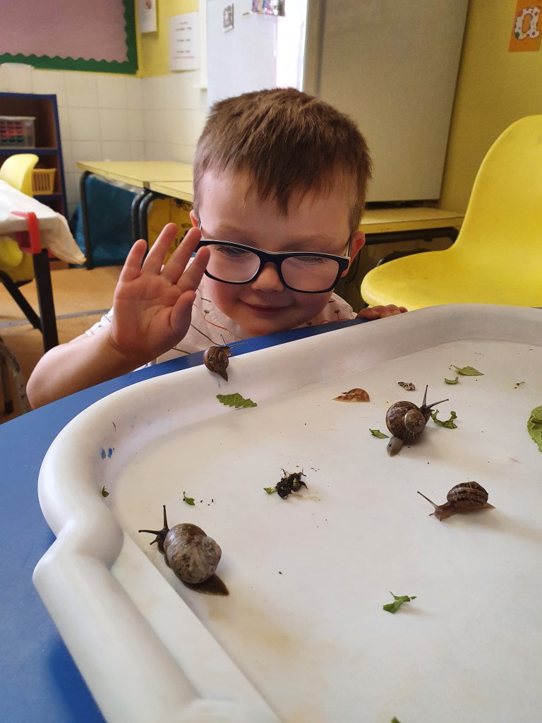 Today we had a big surprise when Shirley brought us some plants, they were housing many many little snails, we watched how they moved for a little bit and fed them some tasty leaves before we released them into the garden