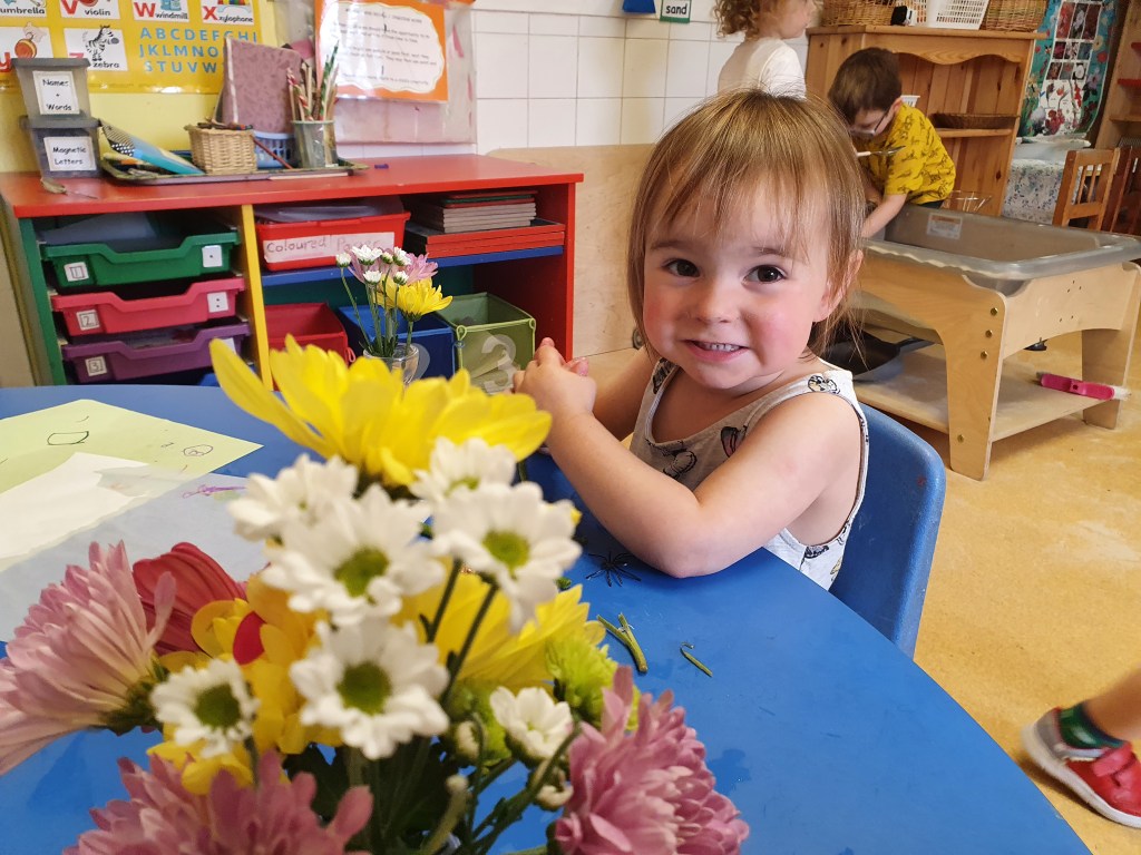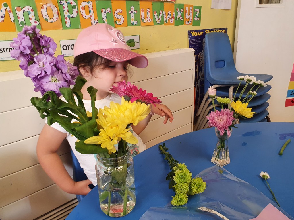 We cut these lovely flowers down and arranged them in vases for our lunch tables. With the stems we used these to write on the table in water and then one of our children had a great idea to use the leftover petals to make perfume with. We took all our extra bits outside to the mud kitchen and had a little experiment with making pefume.