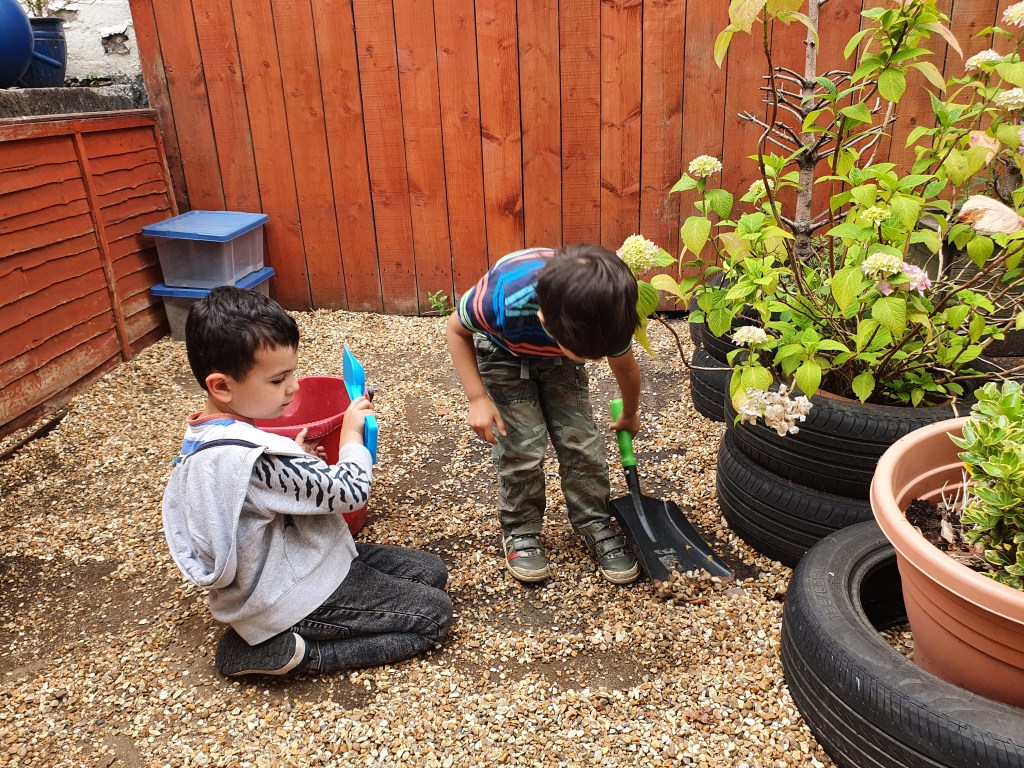Getting ready for our mud kitchen means relocating our digging area, this was a tough job but we managed to use the big tools like the shovel and wheelbarrow to help us out.