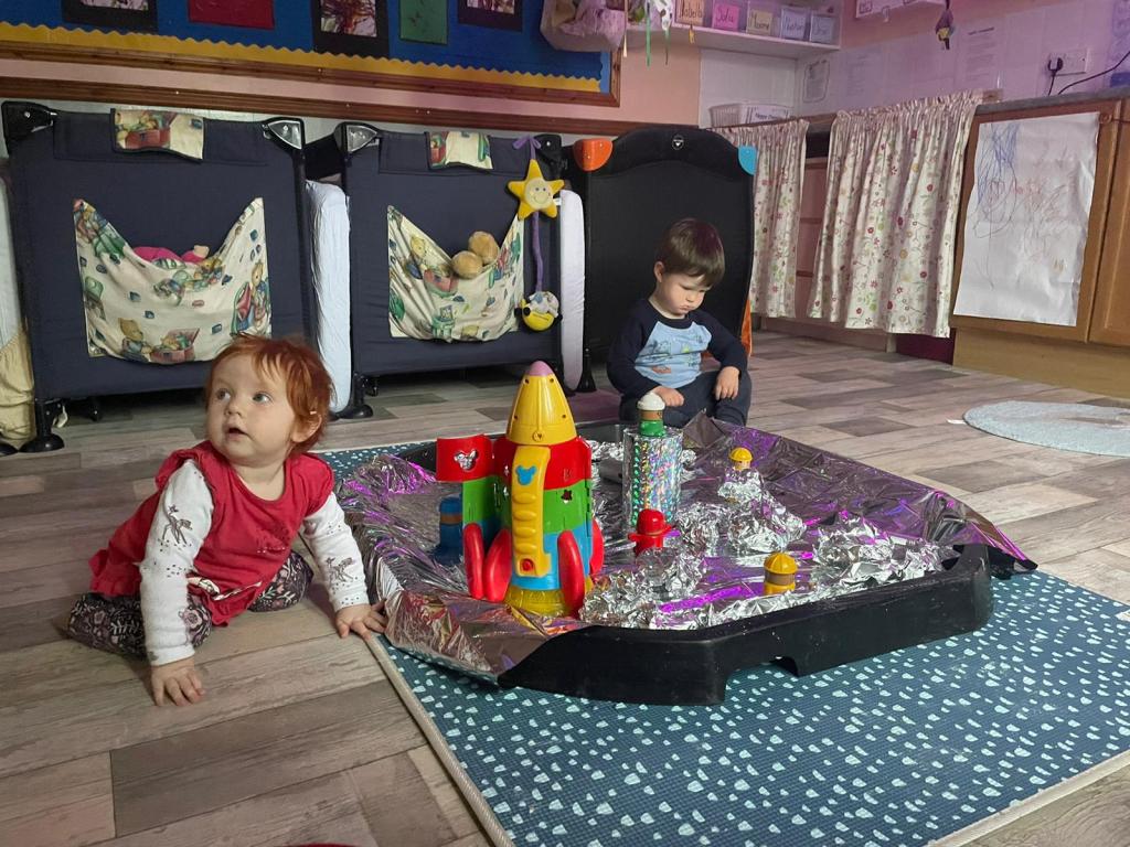 Celebrating space week there were lots of shiny items for us to explore, we especially liked the crinkly space blanket, this made a wonderful noise. We also liked being able to scrunch up tinfoil and make different shaped moon rocks.
