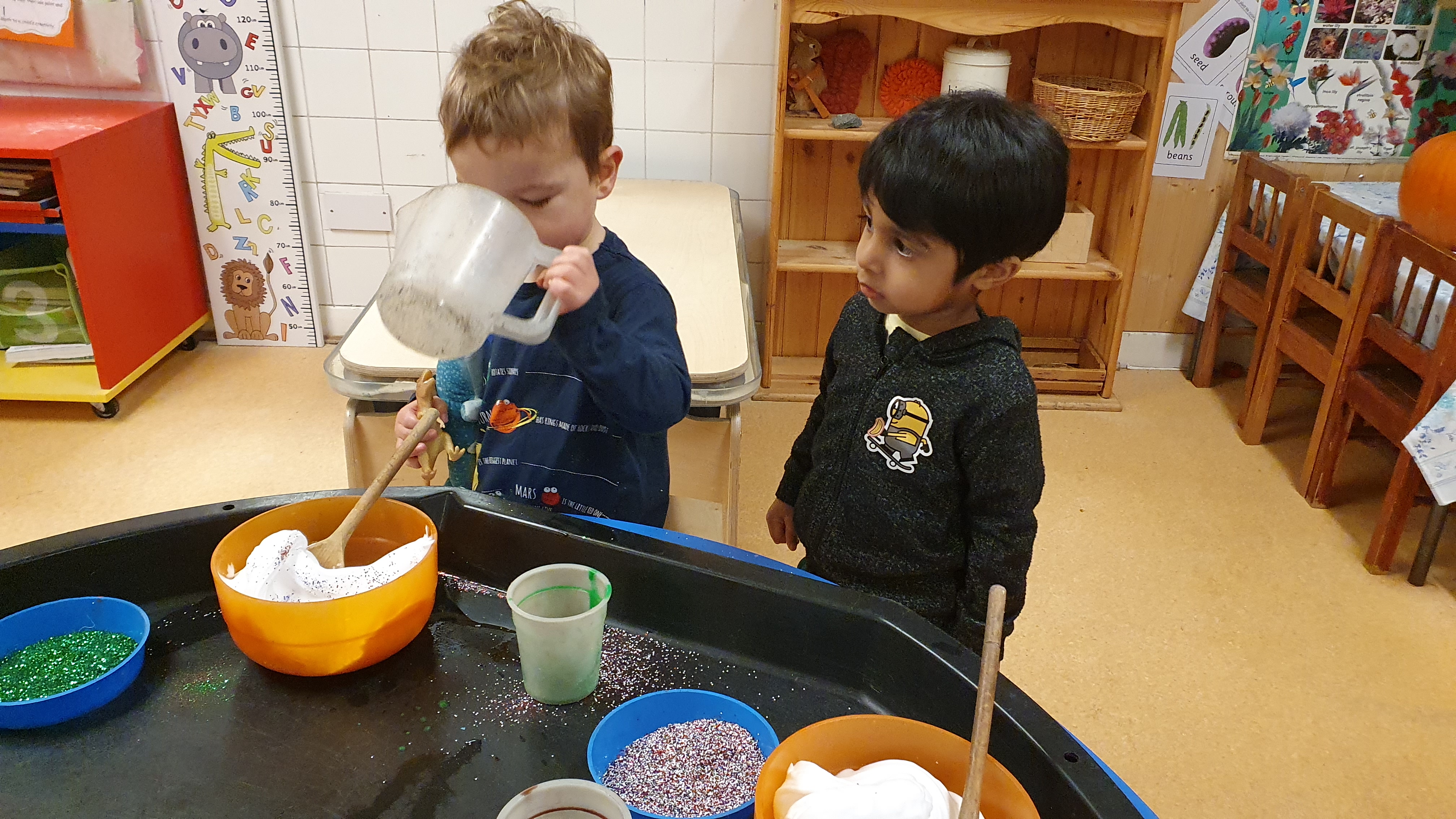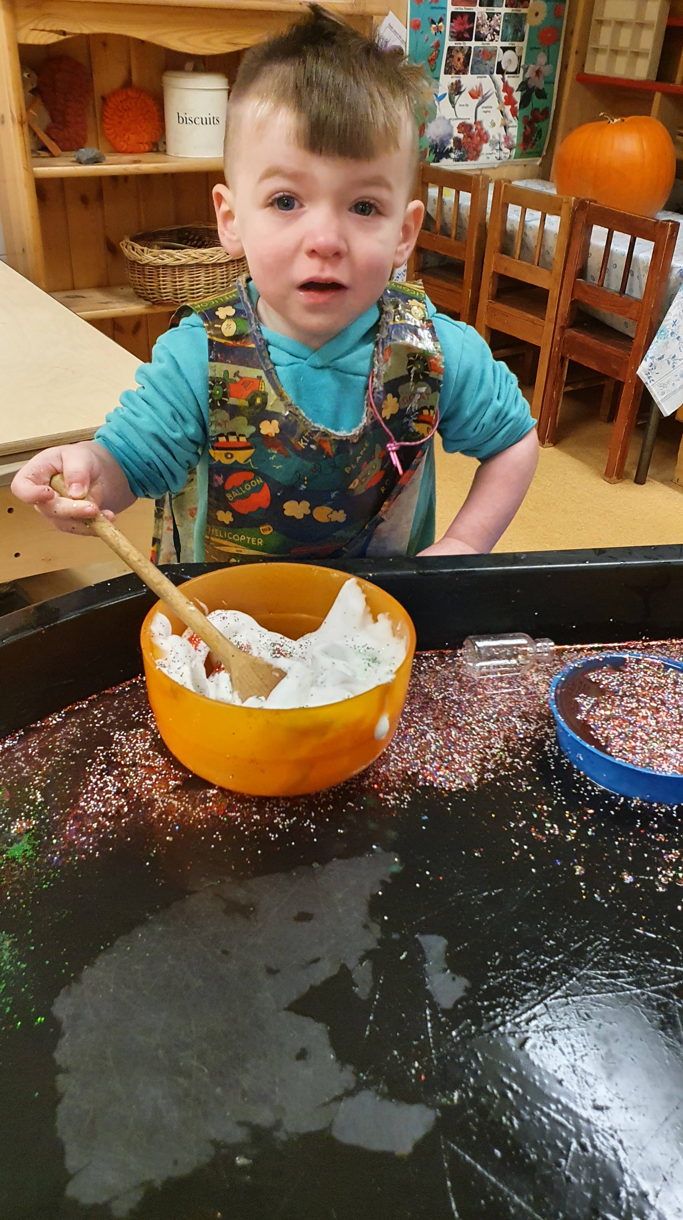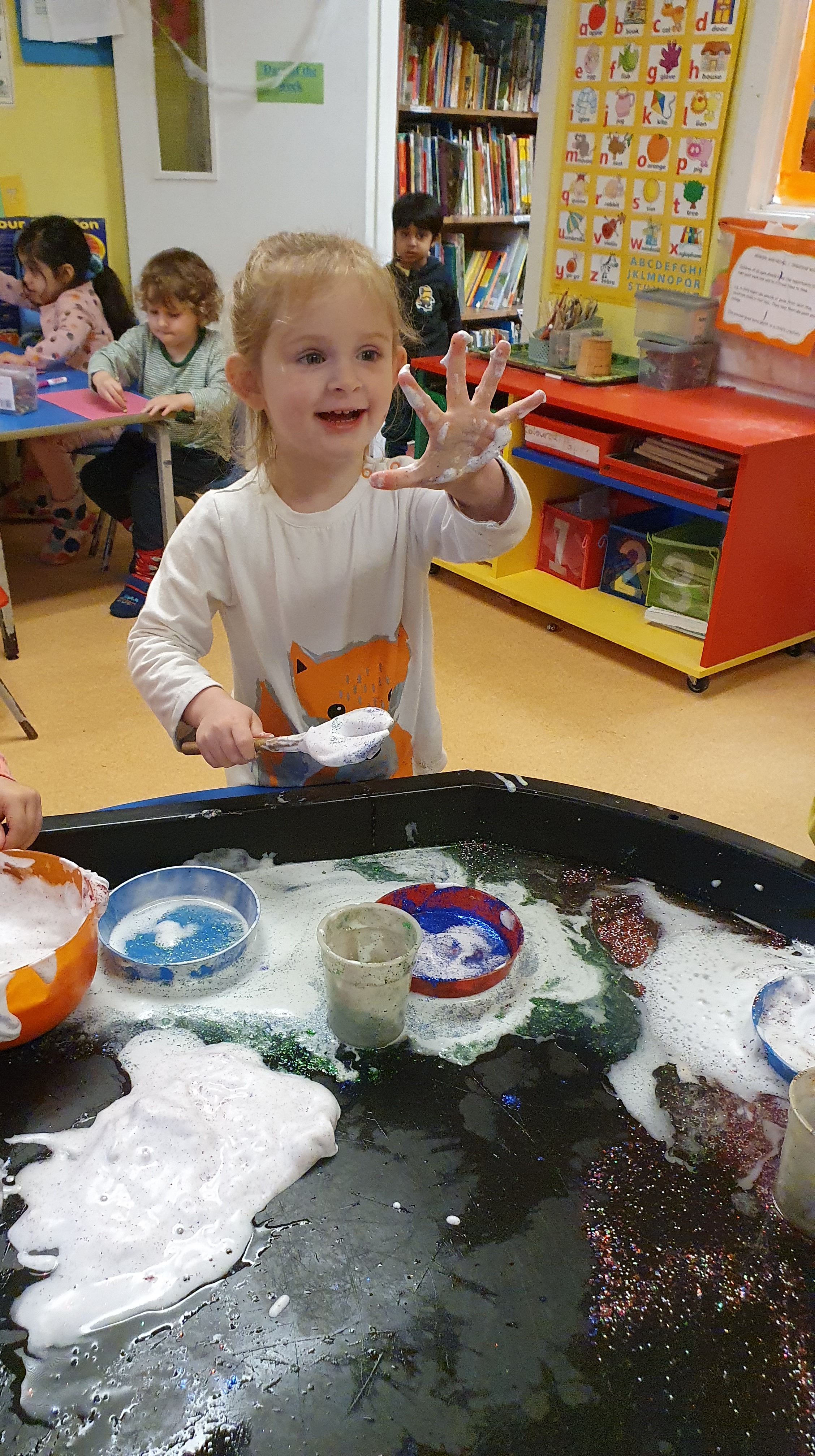 The children have shown an interest in pouring and have really been enjoying water play. Making potions encourages us to think about volume and using vocabulary such as empty and full. It’s also just really fun to play with shaving foam!