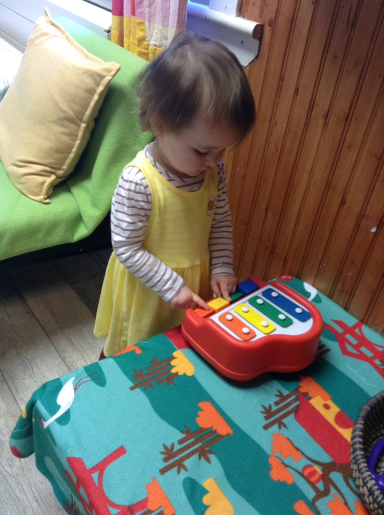 Our babies can select instruments by themselves to explore, this little one decided that the table would be a good place to practice her piano skills
