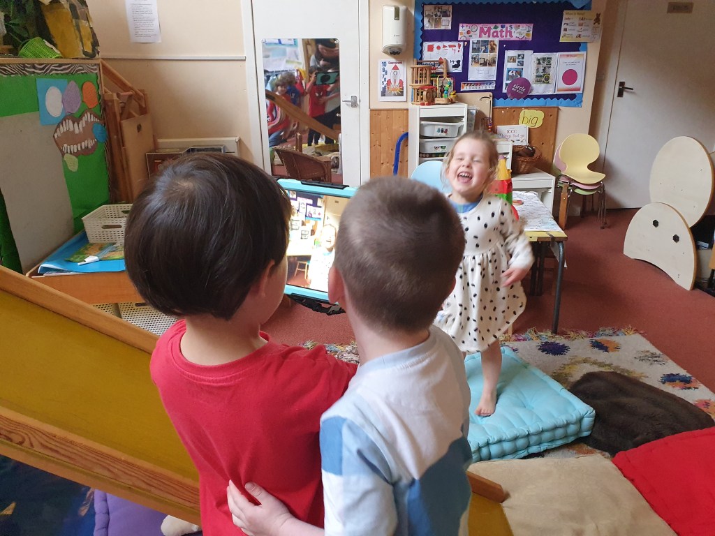 This morning we used the ipad to take pictures of each other, we were able to manage turn taking by ourselves which was very impressive! We loved making funny faces to show our friends and the ladies