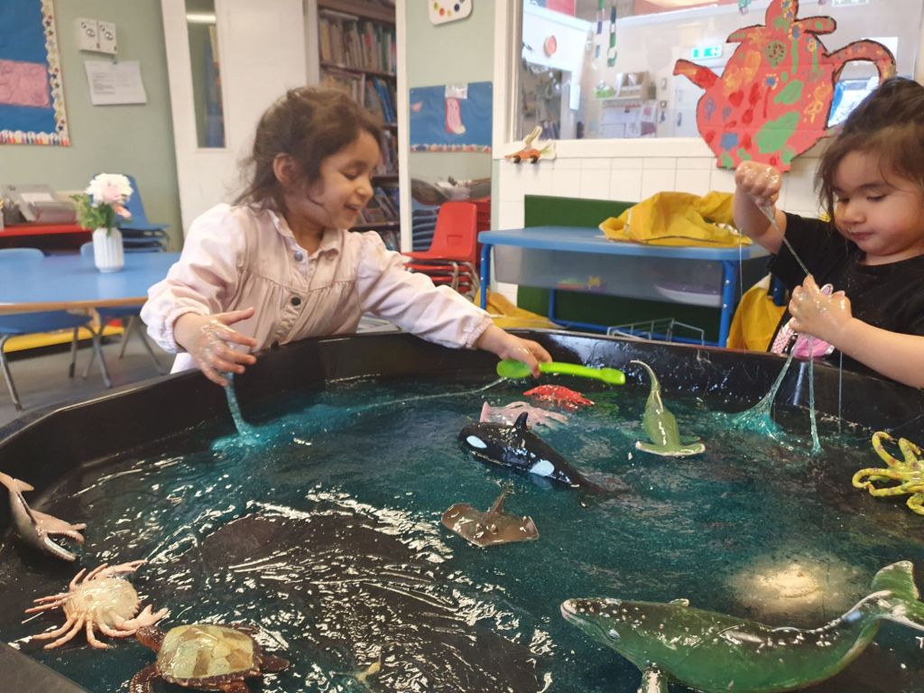 Our tuff tray today kept us engaged for long periods of time. We enjoyed the sensation of the slime falling through our fingers and trying to stretch it apart