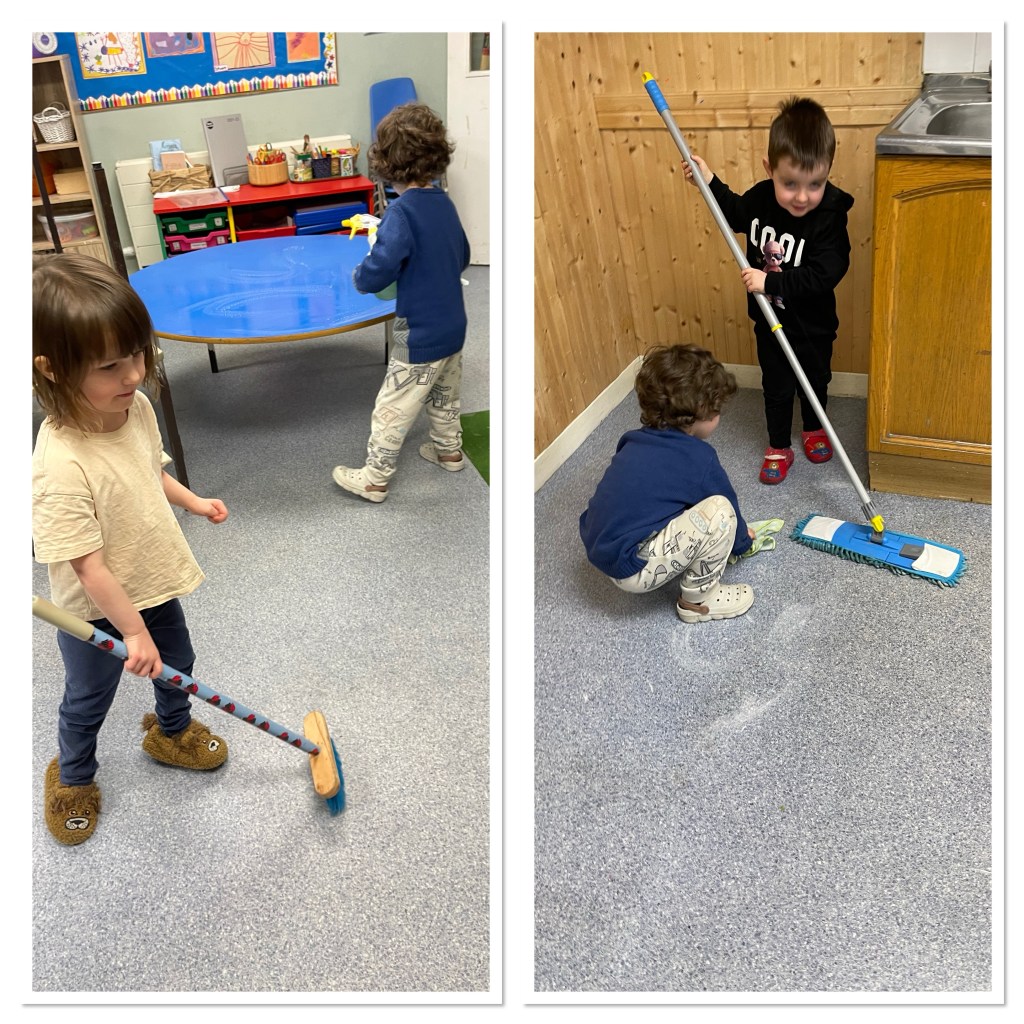 We involve our children in all aspects of nursery routines. They are consulted on changes to rooms and encouraged to take an active role. These 3 pre-schoolers were eager to help clean the area ready for moving furniture.