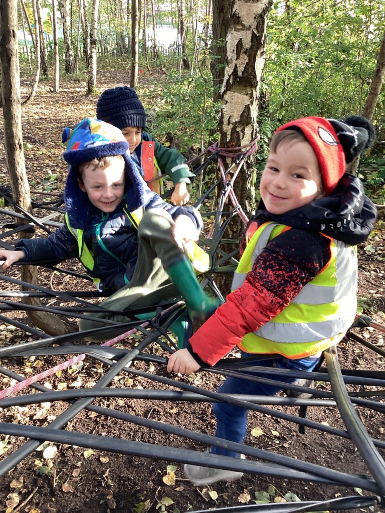 A chilly morning in the children’s wood hanging on the spiderweb, we are very interested in superheroes at the moment and one of our new favourite stories to read is “ten little superheroes”