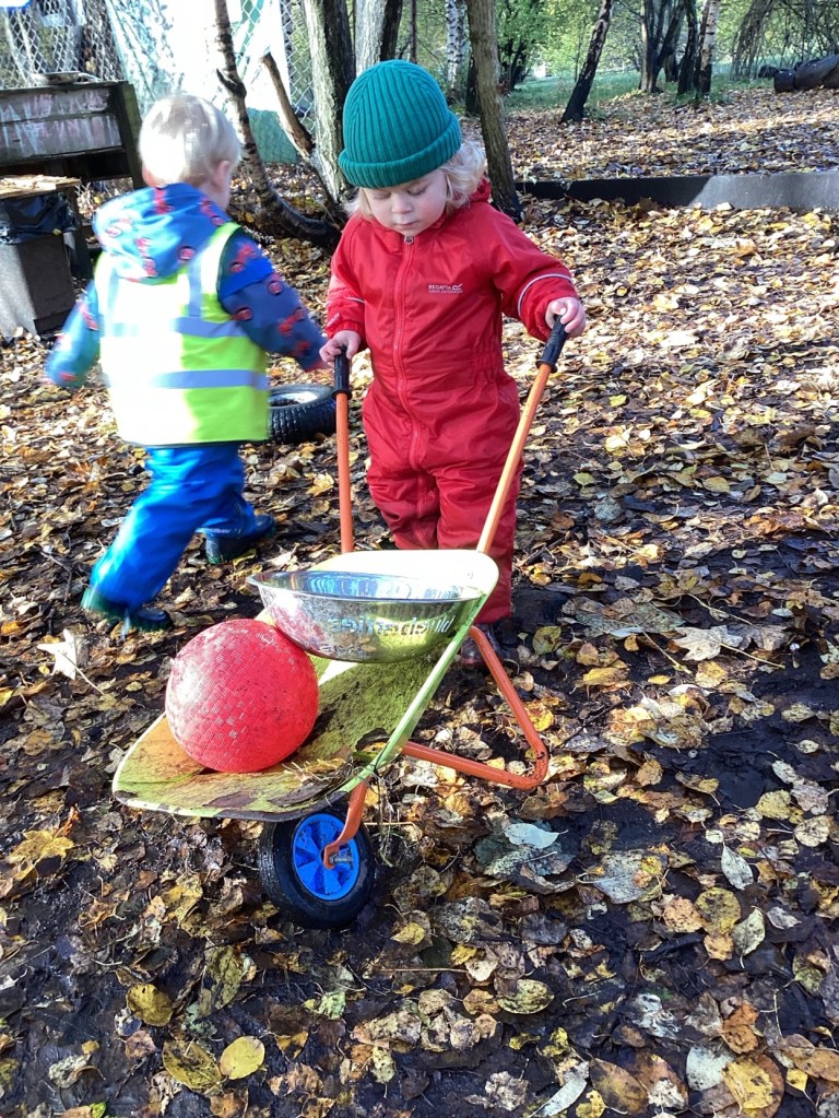Using the wheelbarrow gives us the opportunity to explore the transporting schema. We can fill up the wheelbarrow and zoom around the wide space in the meadow