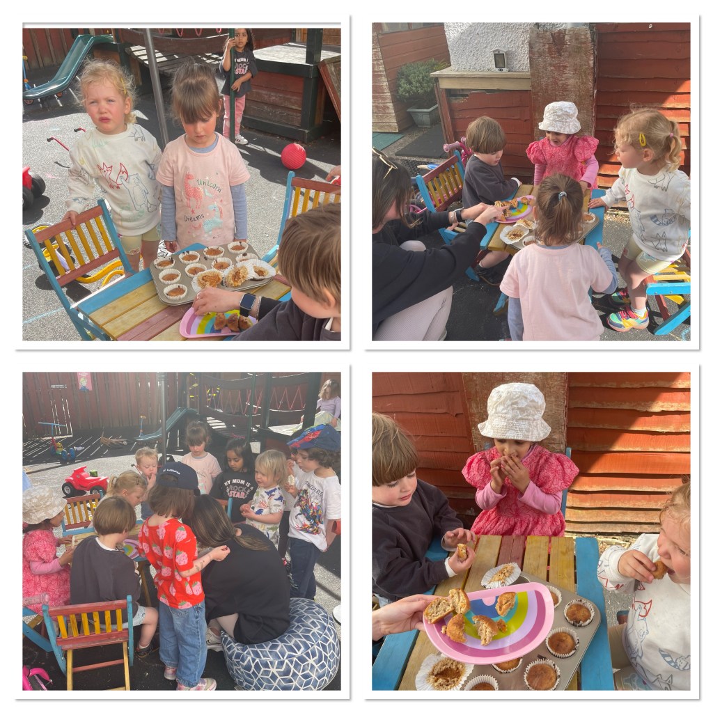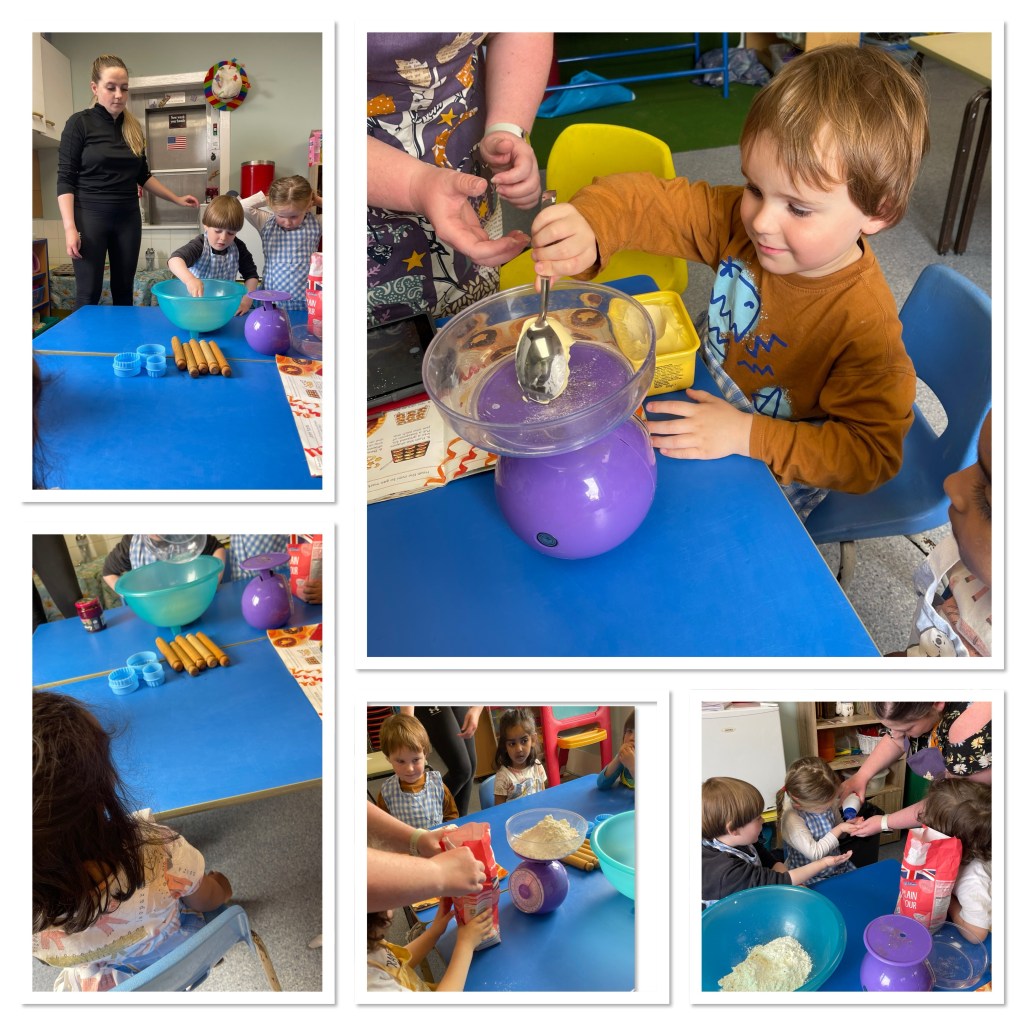 We enjoyed using scales to weigh the ingredients. We are so good at waiting for our turn. Making yummy scones.